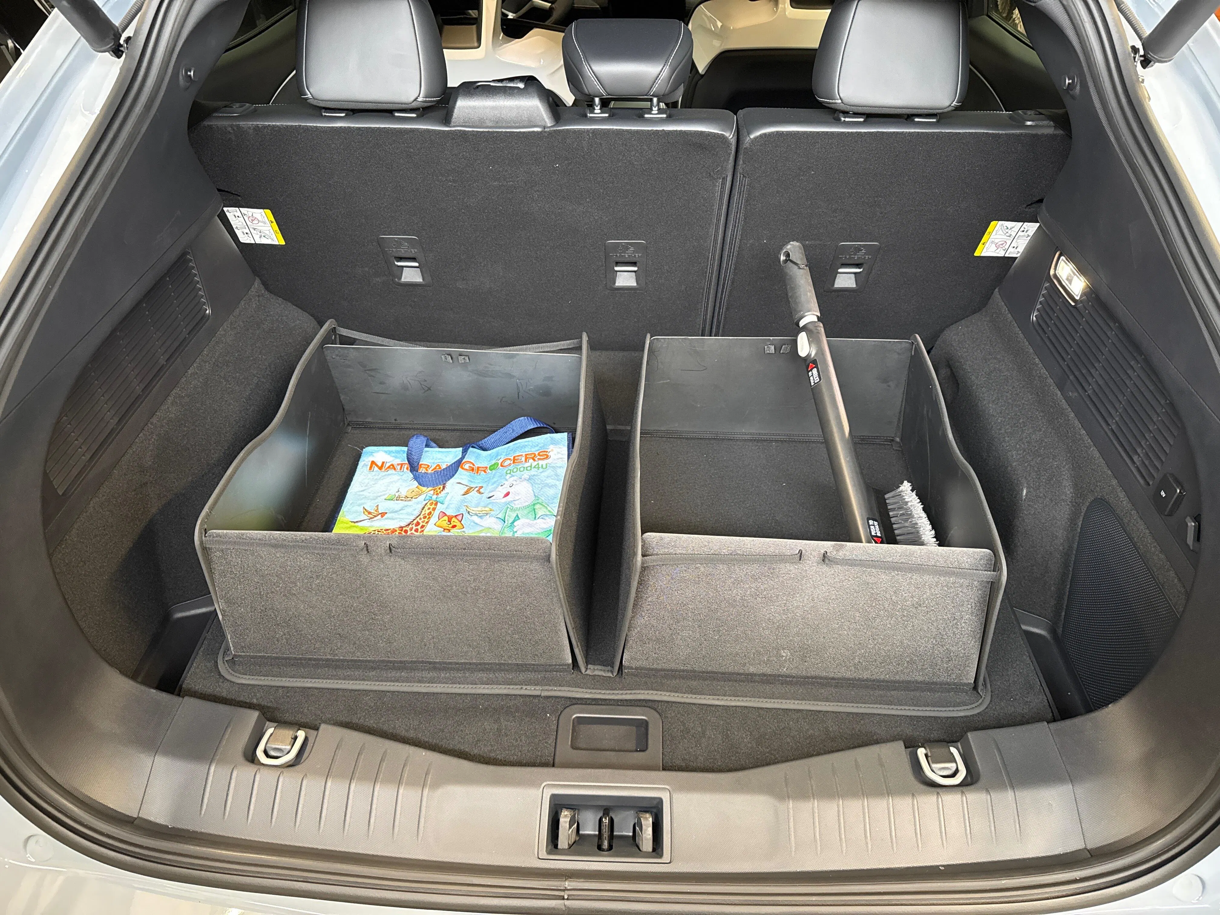 I ordered the large and put it in the back of my Mach-e and it fits great. The bottom of the cargo pro is a felt like material, so as long as you’re placing it on carpet or carpet like material, it won’t slide around. It pops up and folds down easily and it really does a great job of containing the items you put in it. I put Christmas presents in it last night and it contained them perfectly. Anyone that’s ever put wrapped presents in the back of their car knows they slide everywhere. 😉
